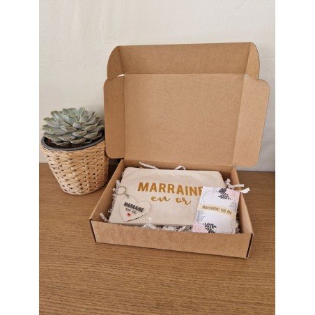 - 1 Pochette beige 22x16 cm 100% coton avec fermeture par zip vintage, inscription Marraine en Or
