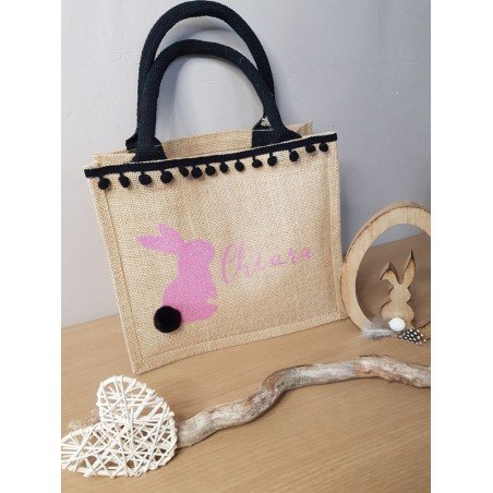 Sac en jute avec prénom de l'enfant, lapin avec pompon tout doux décoré avec du ruban/pompon noir.